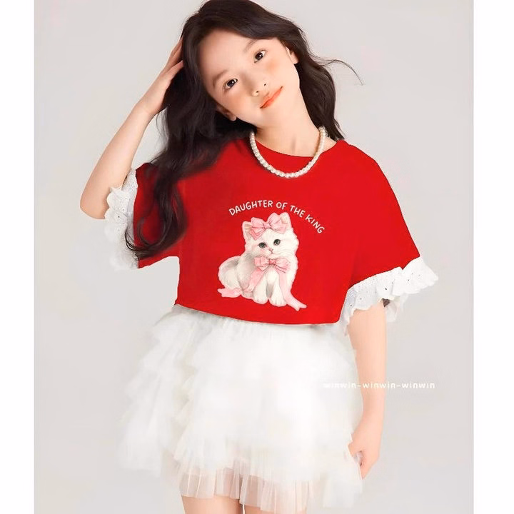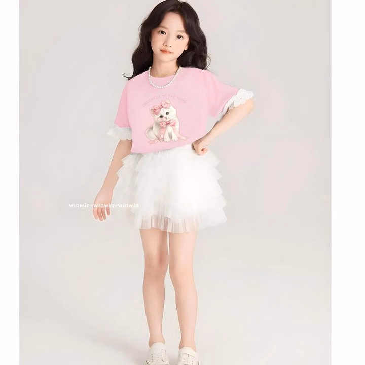 Set Đồ Bé Gái Áo Thun Mèo Phối Ren Tay + Chân Váy Voan Xếp Tầng Siêu Xinh Từ 12-45kg Dành Cho Bé Gái