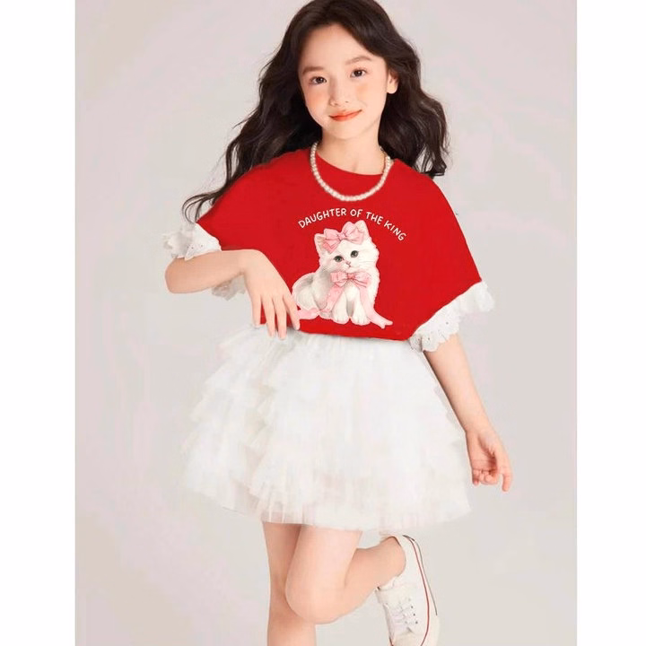 Set Đồ Bé Gái Áo Thun Mèo Phối Ren Tay + Chân Váy Voan Xếp Tầng Siêu Xinh Từ 12-45Kg Dành Cho Bé Gái