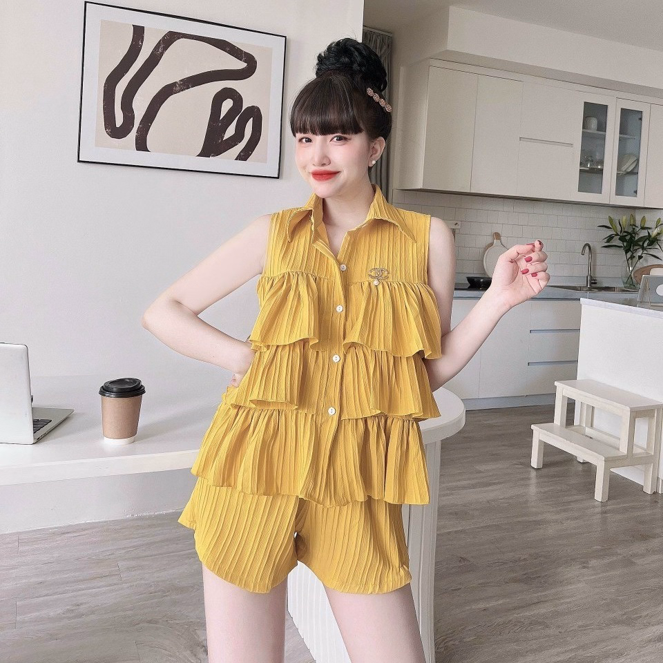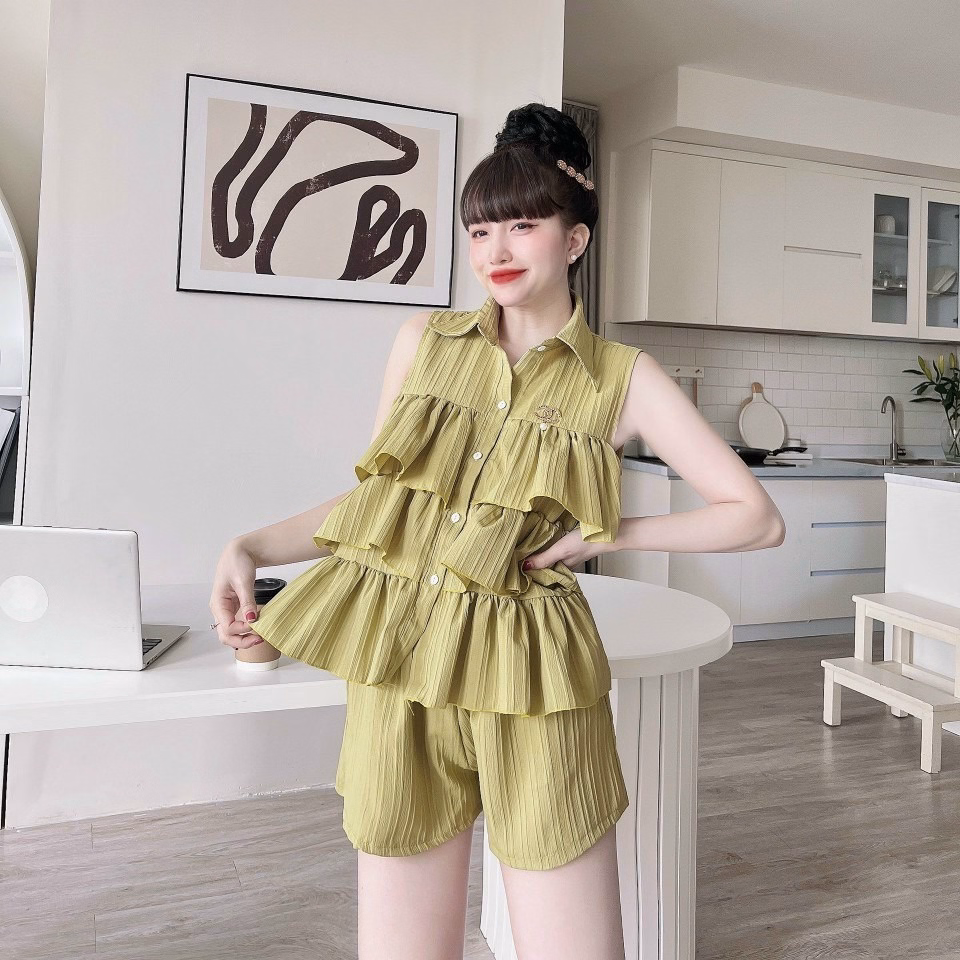 Set Đồ Bộ Chất Đũi Áo Cổ Sơ Mi Sát Nách Kèm Quần Short M496 – Lisa