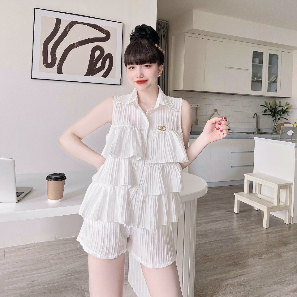 Tên sản phẩm: Set Đồ Bộ Chất Đũi Áo Cổ Sơ Mi Sát Nách Kèm Quần Short M496