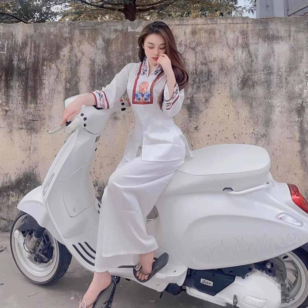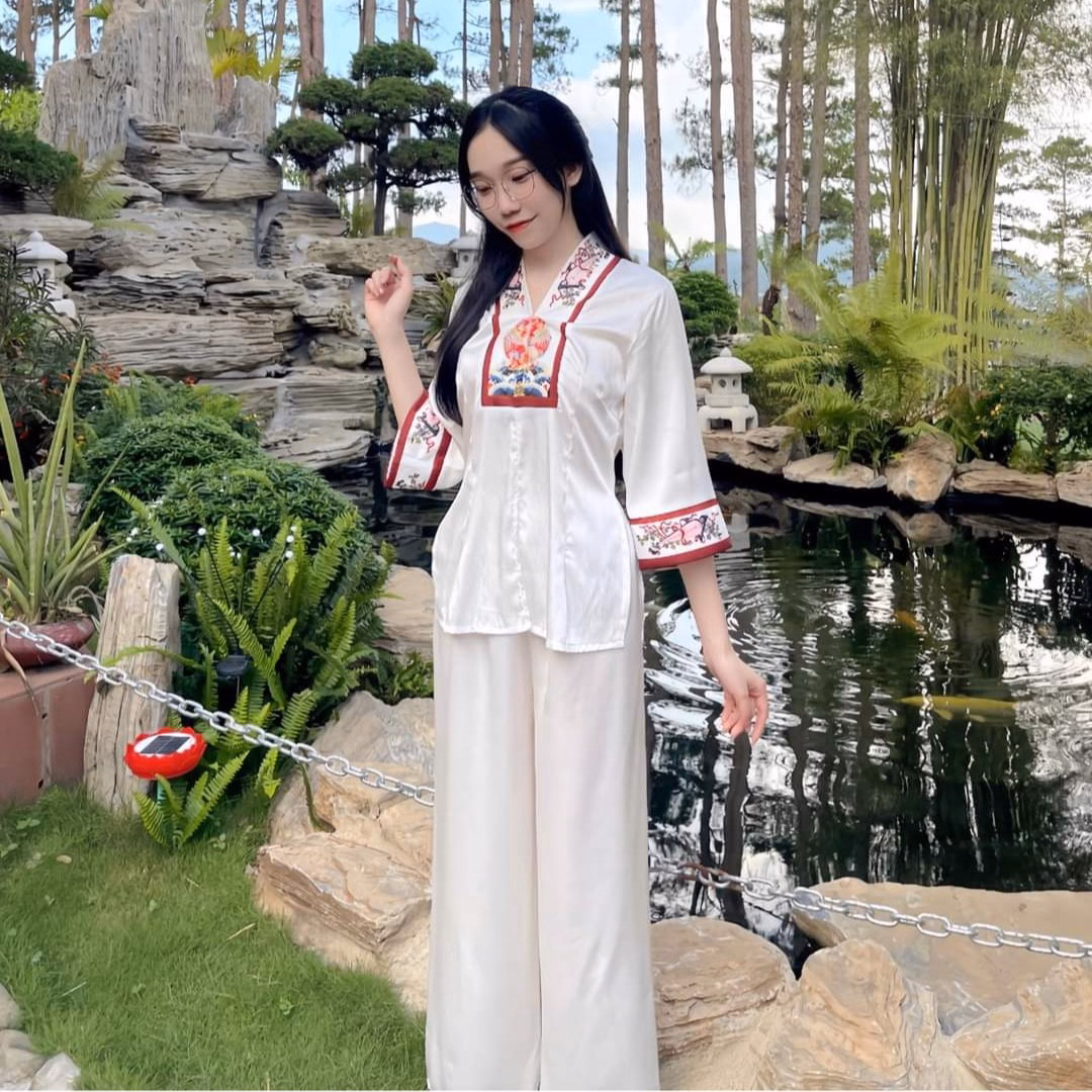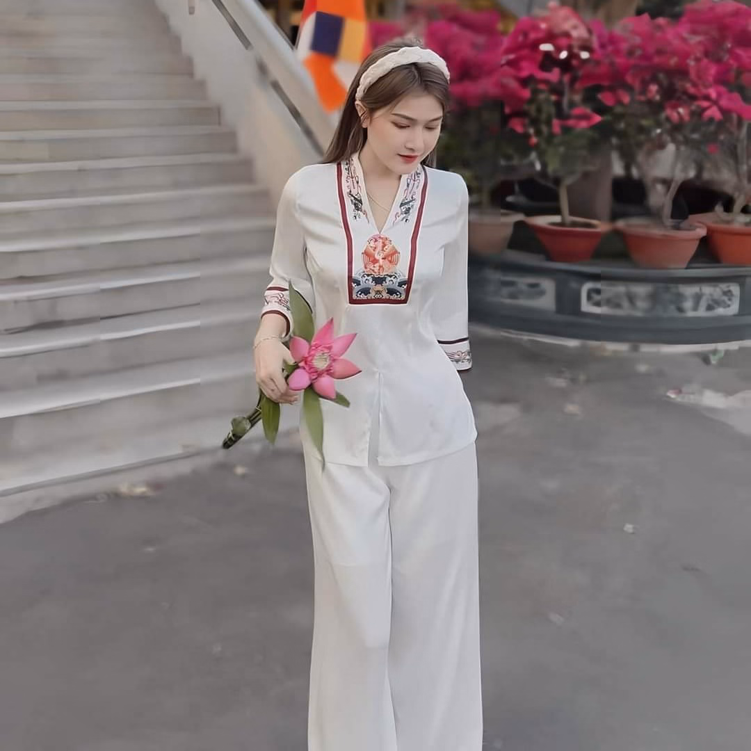 Set Đồ Lam Đi Chùa Vải Lụa Xước, Đồ Bộ Cổ Chữ V Hoạ Tiết Liên Hoa – Shop Mẹ Bống