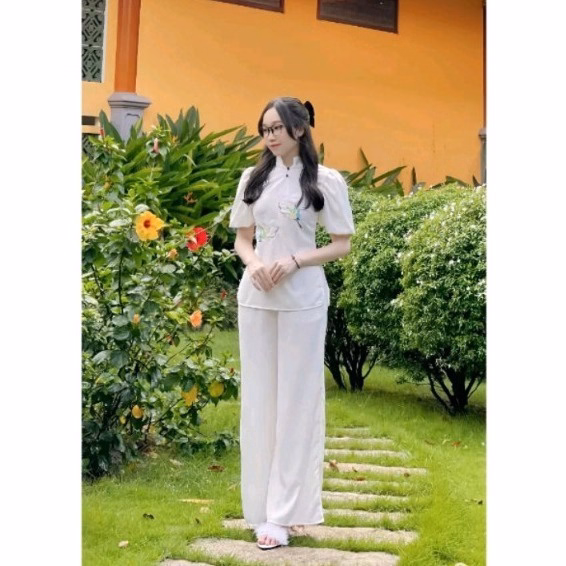Đồ Lam Đi Chùa Nữ Thêu Đôi Hạt Tay Phồng