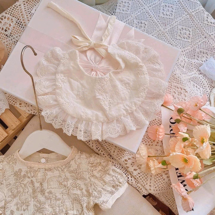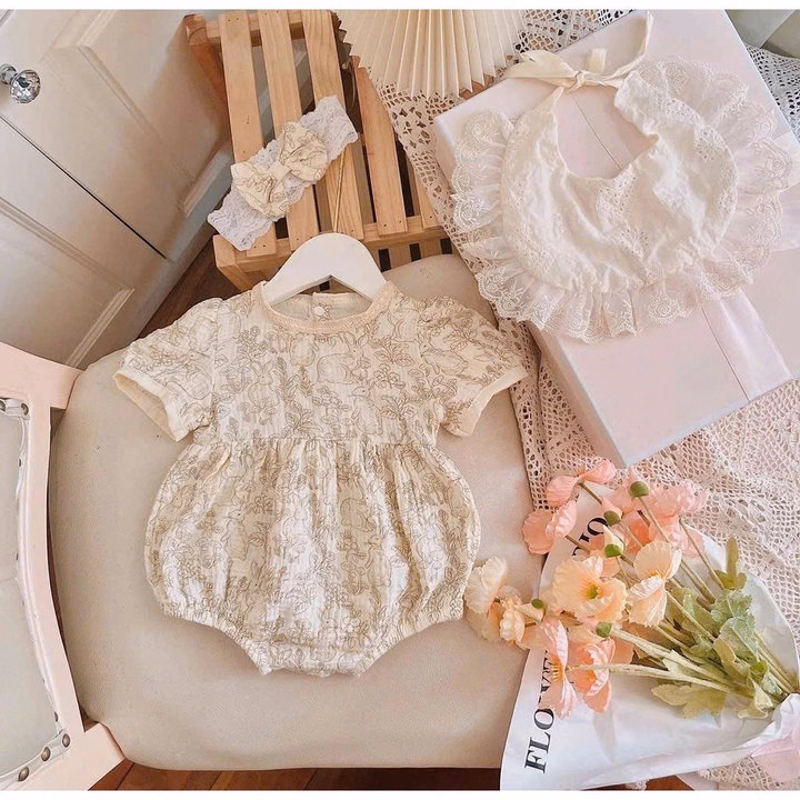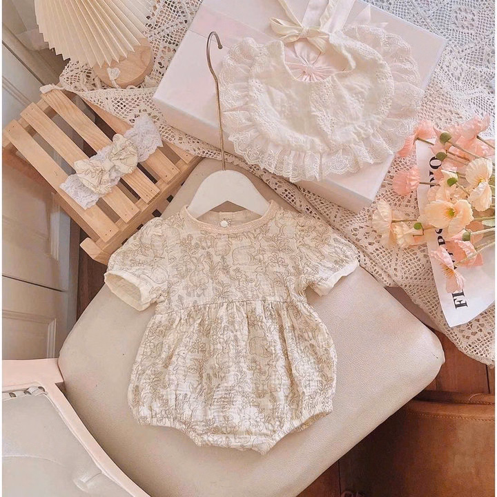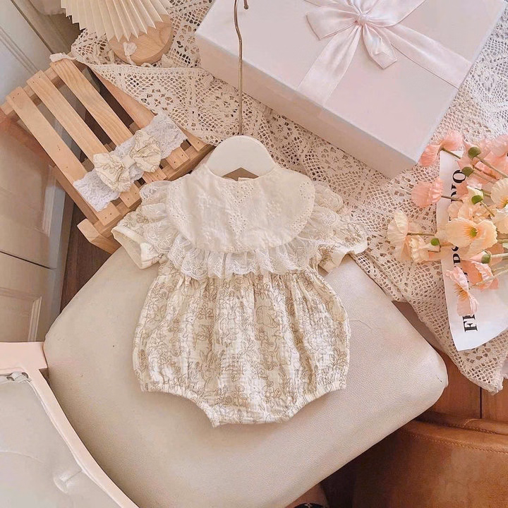 Set Đồ Liền Thân Body Yếm Ren Cổ Rời Băng Đô Kem Bé Gái Sơ Sinh 1 2 Tuổi