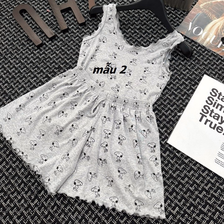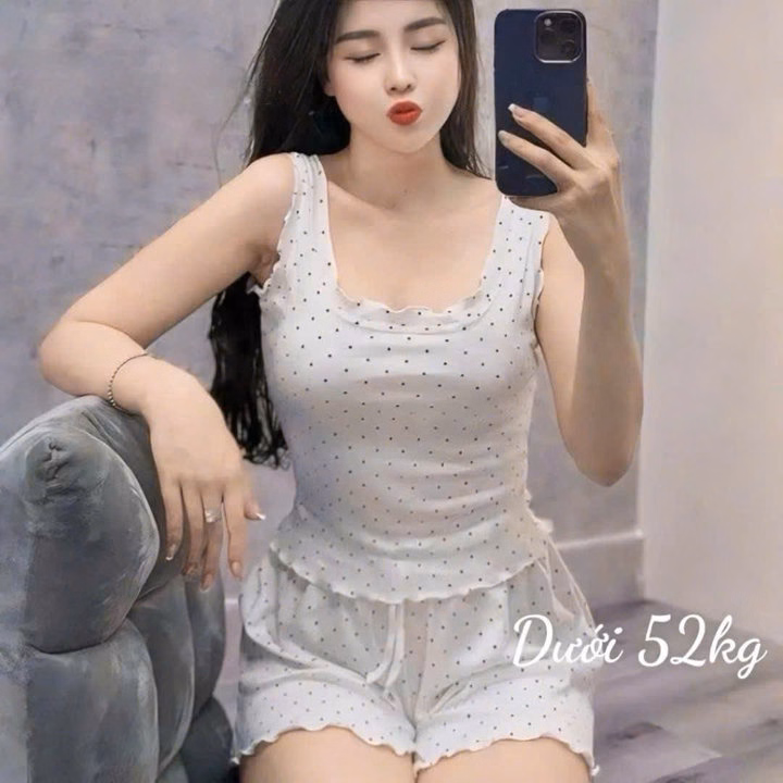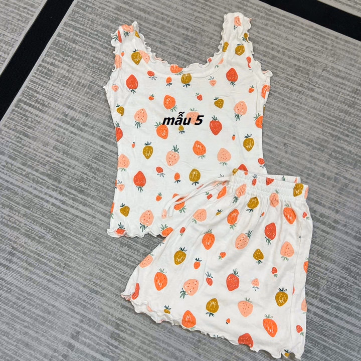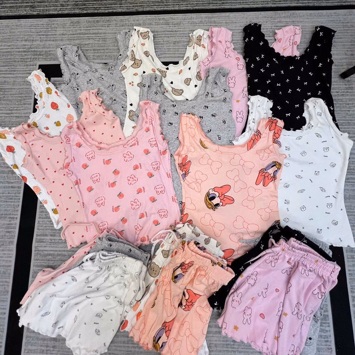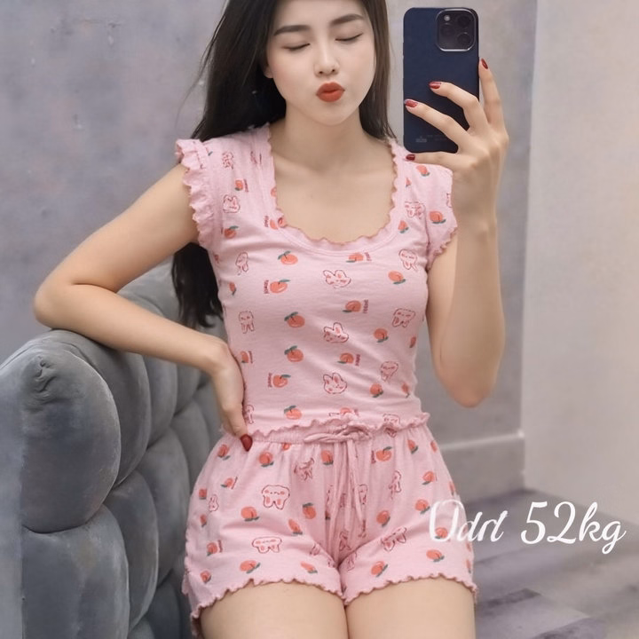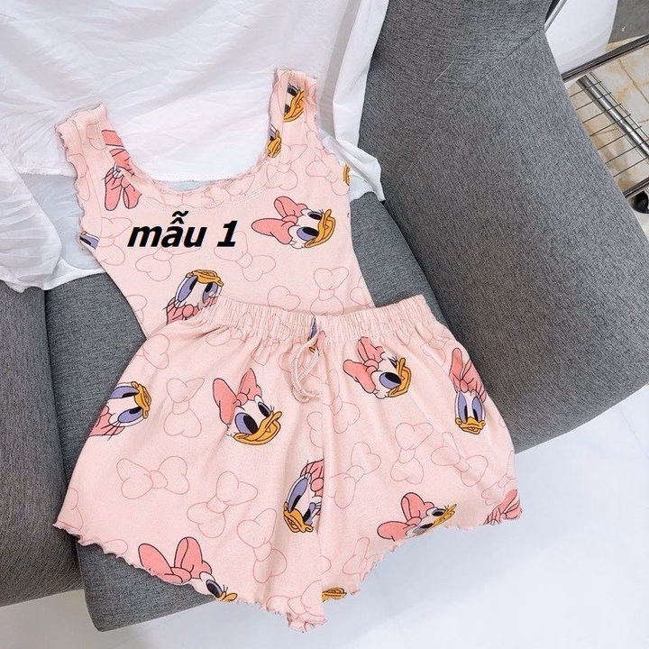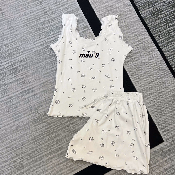 _ Thiết kế bộ mặc nhà in hình xinh xắn , áo ba lỗ viền bèo kèm quần short thời trang