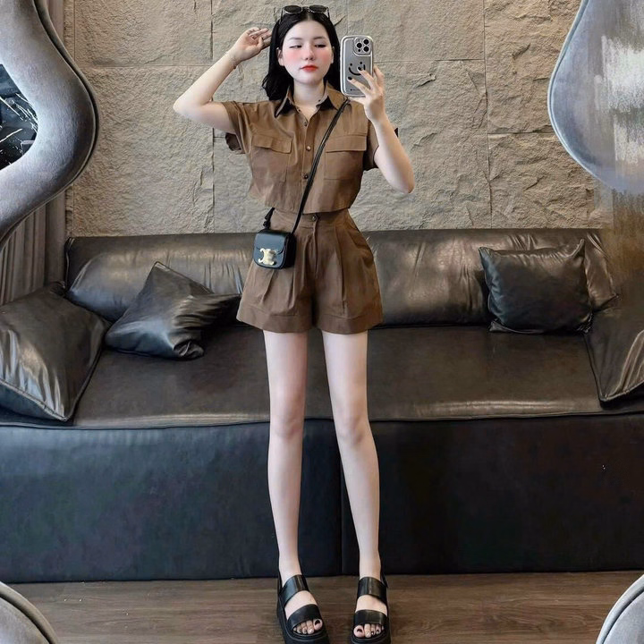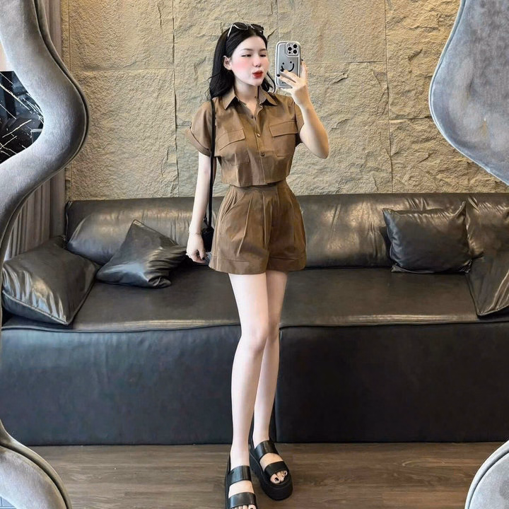 Sét Đồ Nữ Áo Croptop Cổ Bẻ, Gài Nút Mix Quần Đùi Lưng Cao Với Tone Màu Trầm Dành Cho Các Nàng Mặc Nhà, Cafeee Siêu Xinh – Sht167 – Minh Hà House