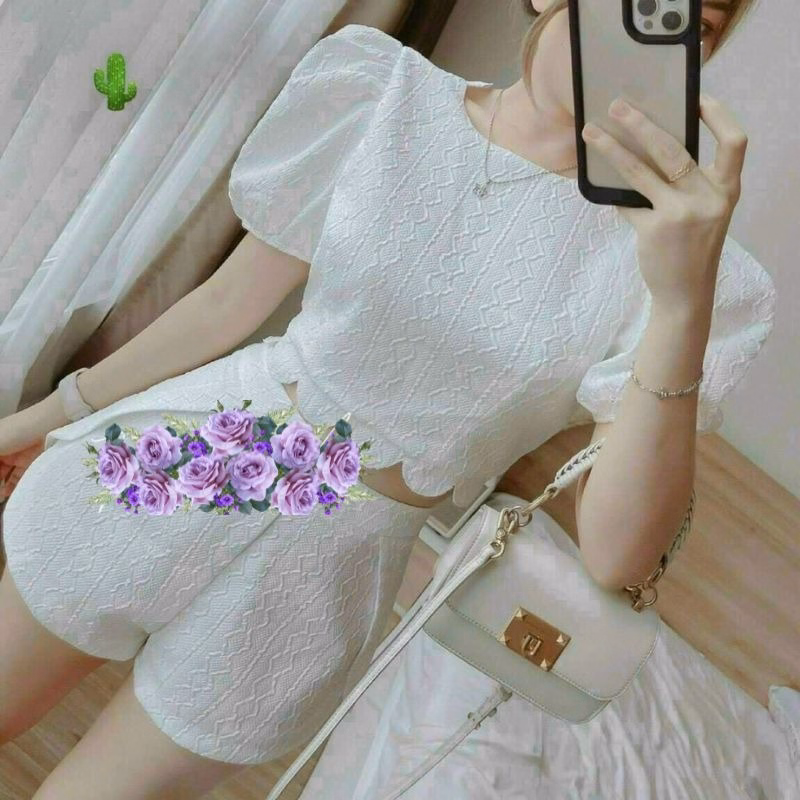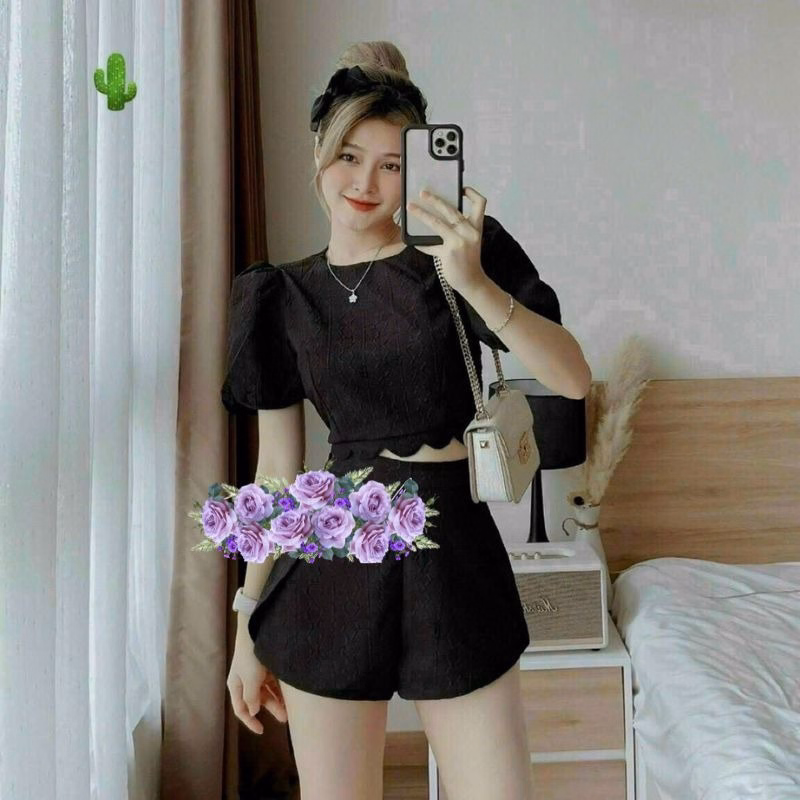 Set Đồ Nữ Chất Vải Xốp Áo Croptop Tay Phồng Phối Quần Short – Ausa House