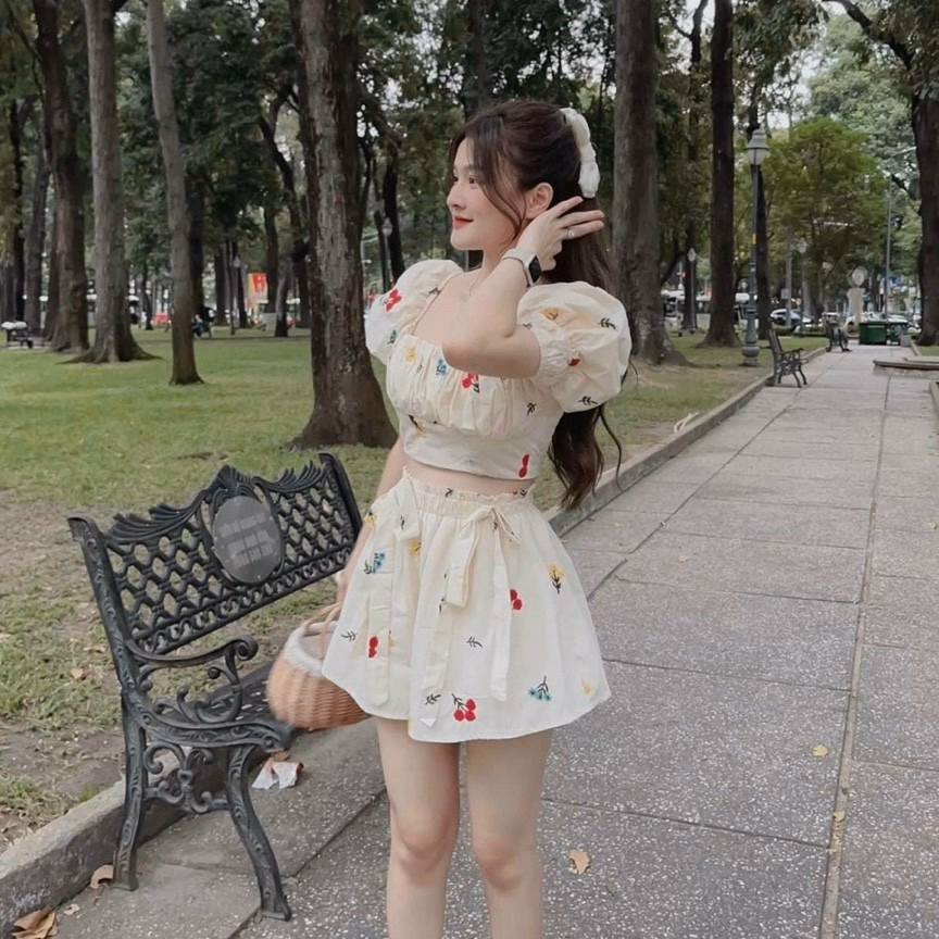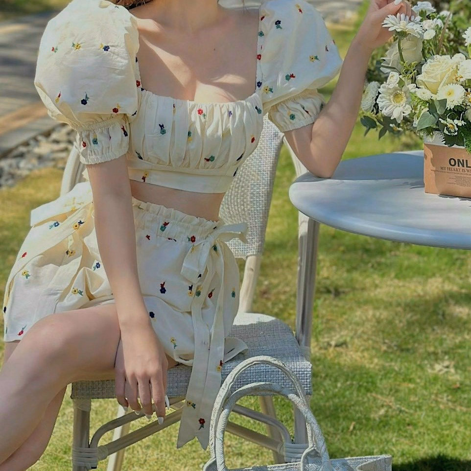 Set 3 Món Áo Tăm Đính Hoa Khoác Voan Giấy Mix Chân Váy Đũi Xốp Tb105Kf-Nana House