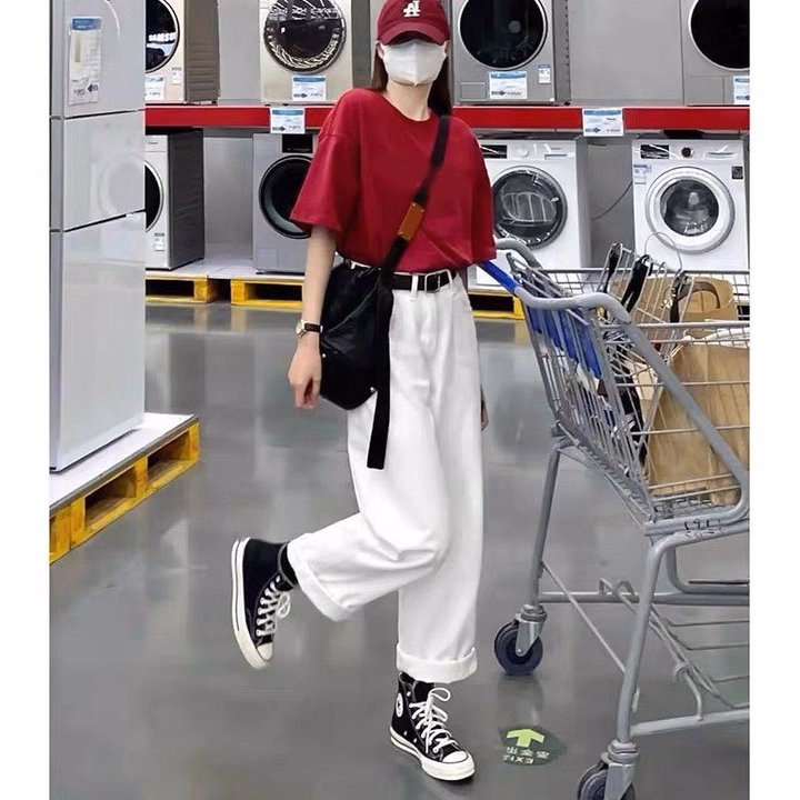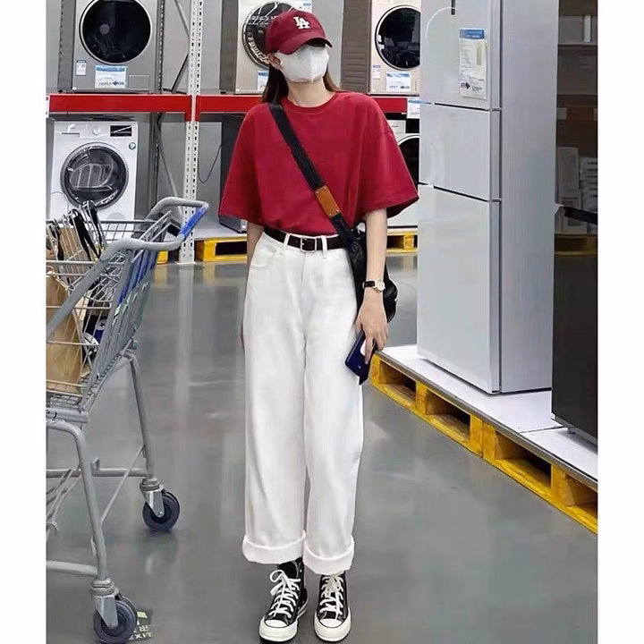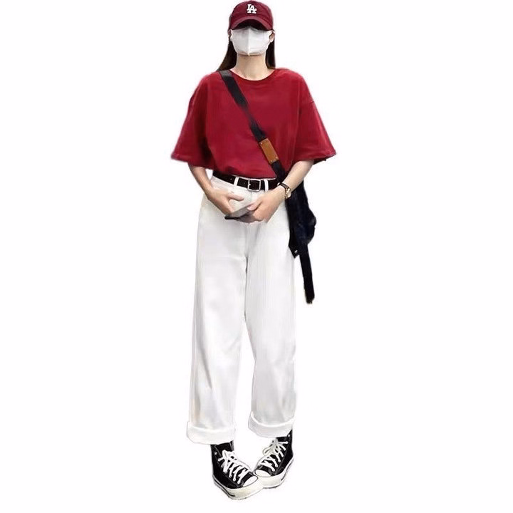 Set Quần Kaki Trắng 2 Khuy + Áo Cotton Trơn Đỏ