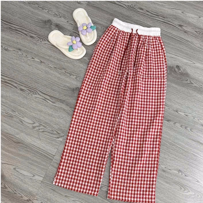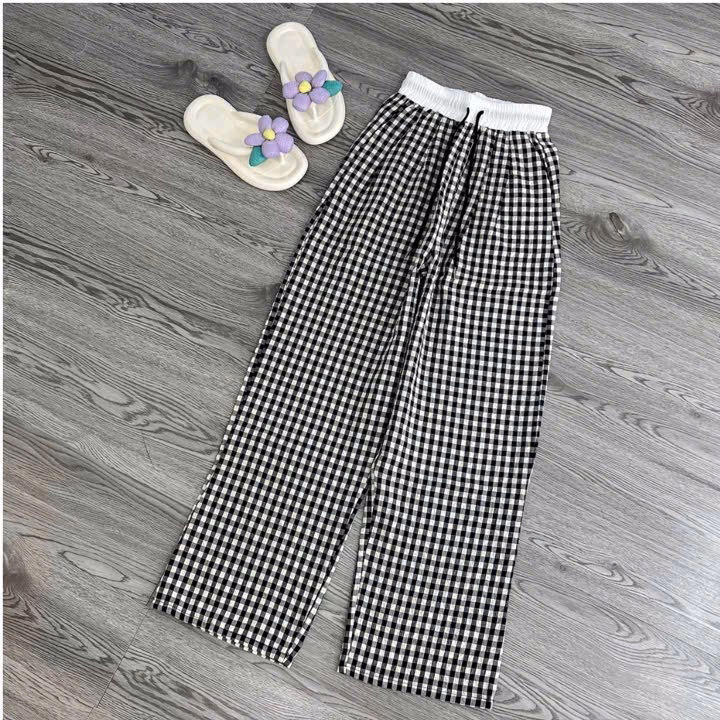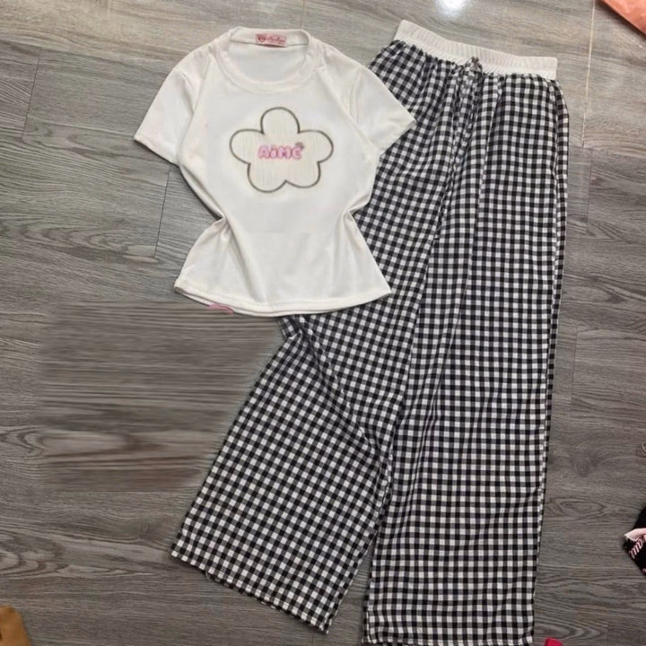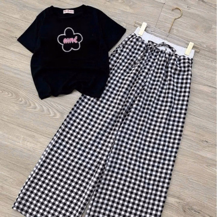Sét Quần Kẻ Caro Mini Cạp Cao + Mix Áo Thun Croptop Tăm Thêu Bông Hoa