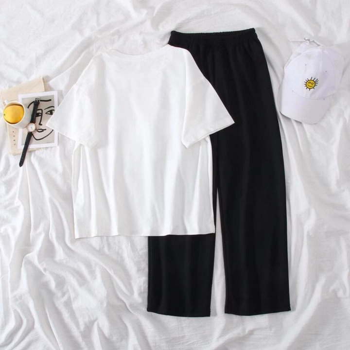 Sét Quần Ống Rộng Cạp Chun Đen Hack Dáng + Kèm Áo Phông Trơn Cotton Khô 3158 Loại 1