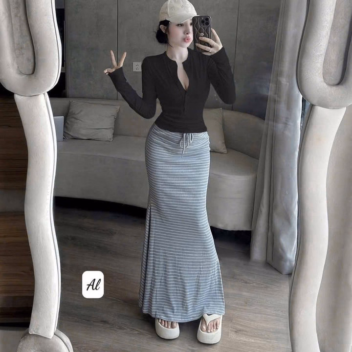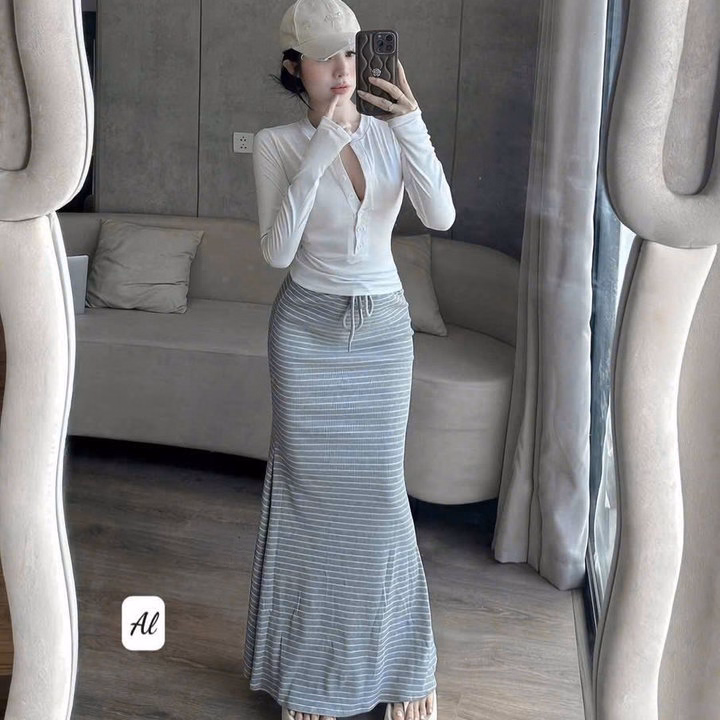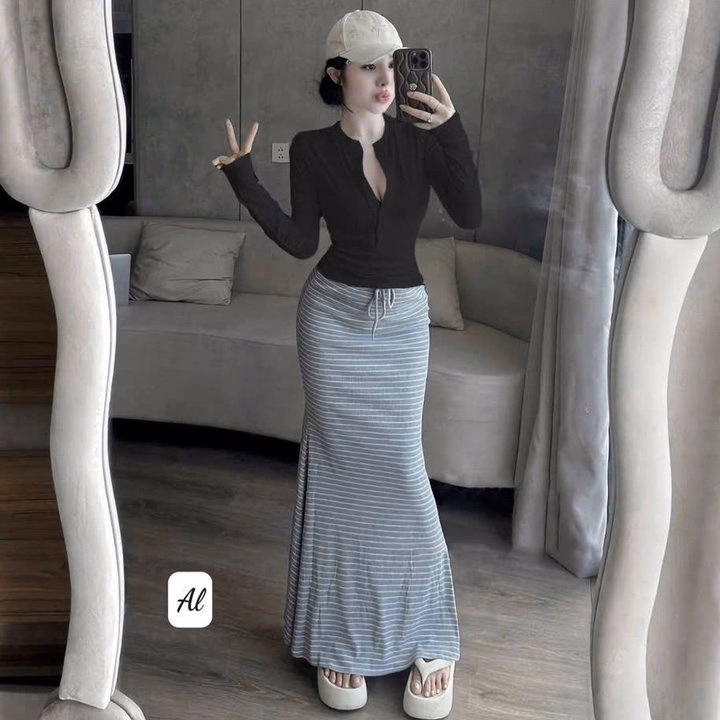 Set Váy Áo Thun Tăm Lạnh Tay Dài Nút Trụ Bt94Yz