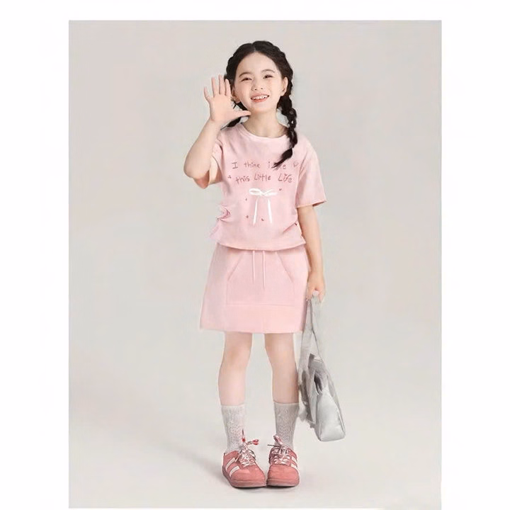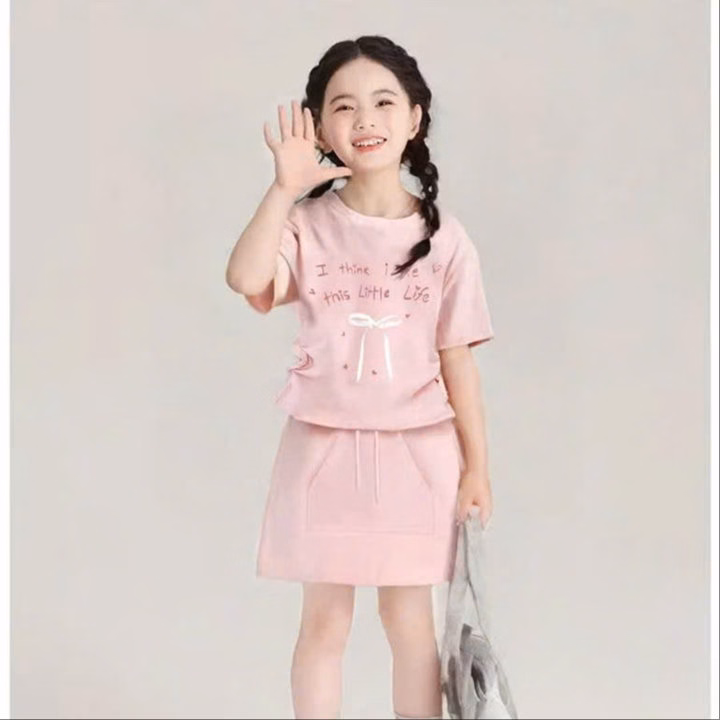 1. Tên sản phẩm : Set Váy Bé Gái Áo Thun Dây Rút Đính Nơ Kèm Chân Váy Chữ A Từ 12-45kg Dành Cho Bé Gái