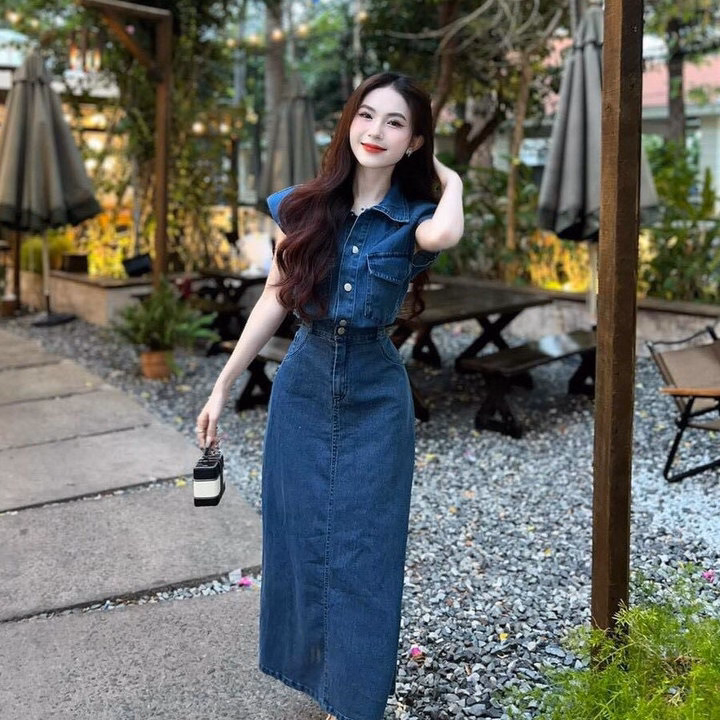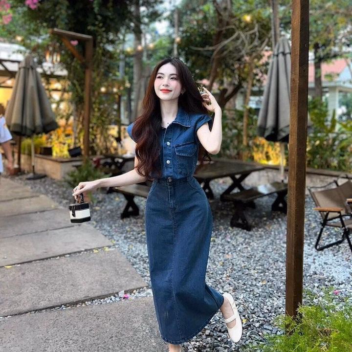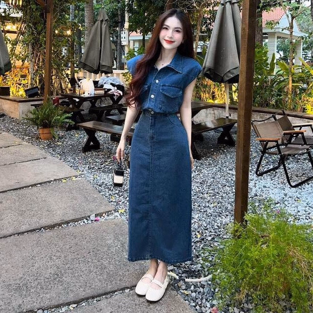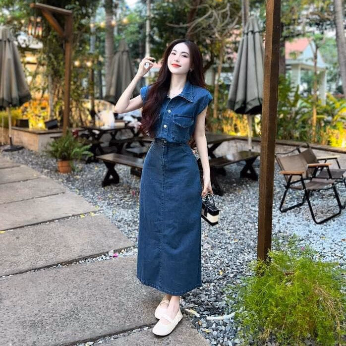 Set Váy Denim Cài Nút Chân Váy Dài Cổ Trụ St1143- Sam Store