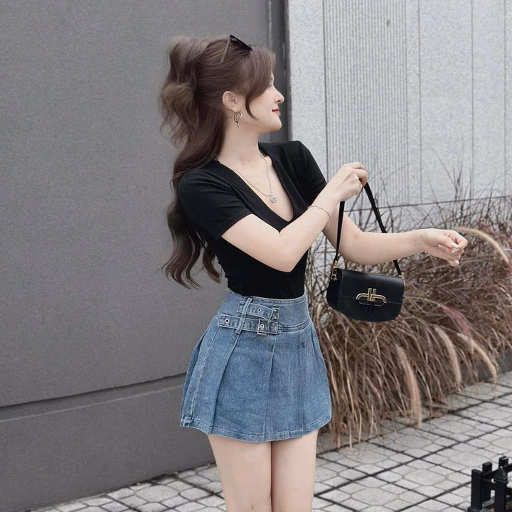Set Váy Denim Xếp Ly Mix Áo Thăm Lạnh Cổ Tim Bt100Fs-Sam Store
