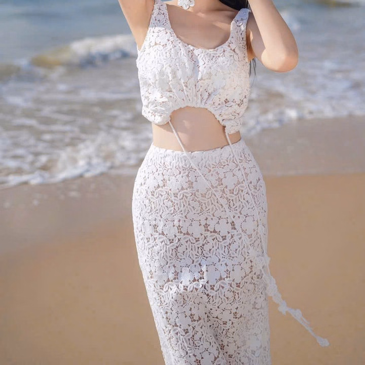 Set Váy Maxi Vải Ren Dáng Dài 2 Dây Chữ A Thời Trang Nữ Mặc Đi Biển Xinh Xắn
