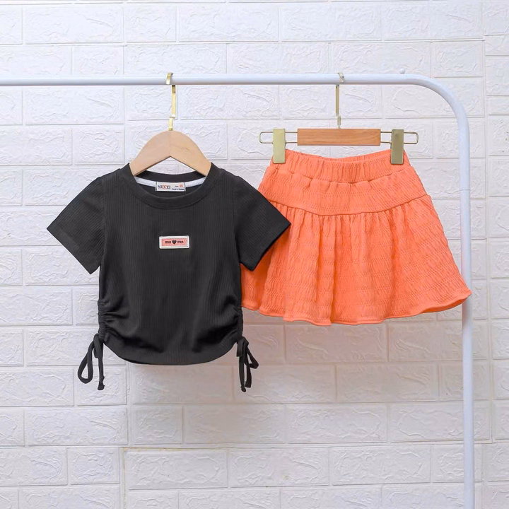 1. Tên sản phẩm : Set Váy Thun Gân Áo Đính Logo Min Min Bé Gái Từ 12-45kg Cho Bé Gái