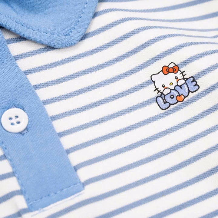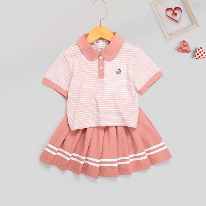 Set Váy Xếp Ly Bé Gái Áo Thun Sọc Cổ Bẻ Ngắn Tay Từ 12-45Kg In Kitty Hottend Cho Bé Gái