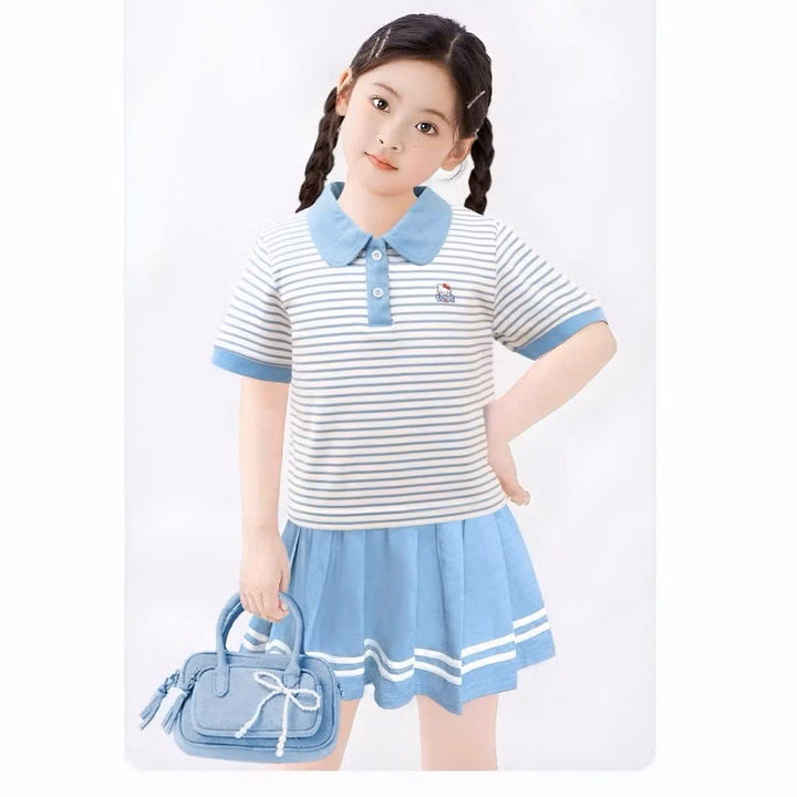 Set Váy Xếp Ly Bé Gái Áo Thun Sọc Cổ Bẻ Ngắn Tay Từ 12-45kg In Kitty Hottend Cho Bé Gái