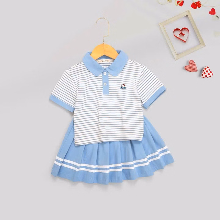 1. Tên sản phẩm : Set Váy Xếp Ly Bé Gái Áo Thun Sọc Cổ Bẻ Ngắn Tay Từ 12-45kg In Kitty Hottend Cho Bé Gái