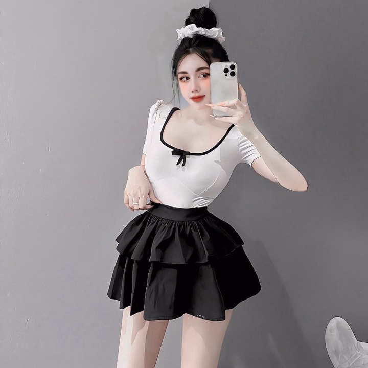 Chất liệu: áo thun gân tăm lạnh, chân váy kate có quần trong