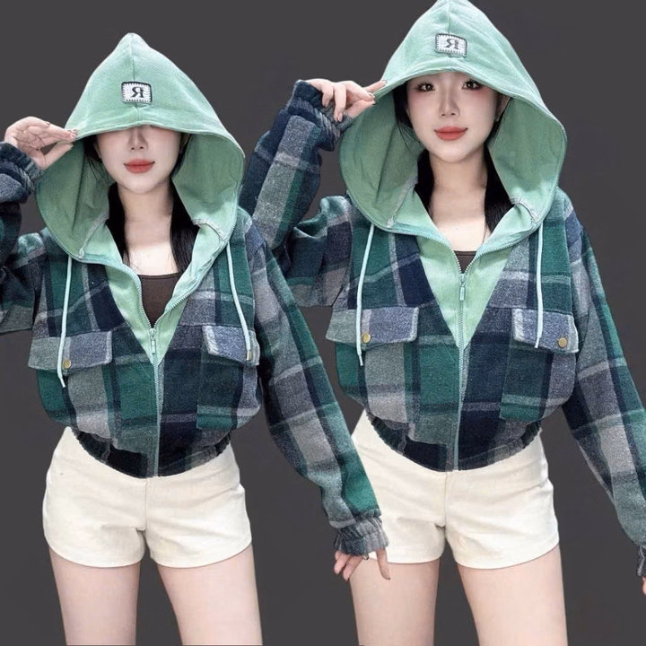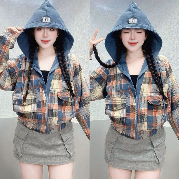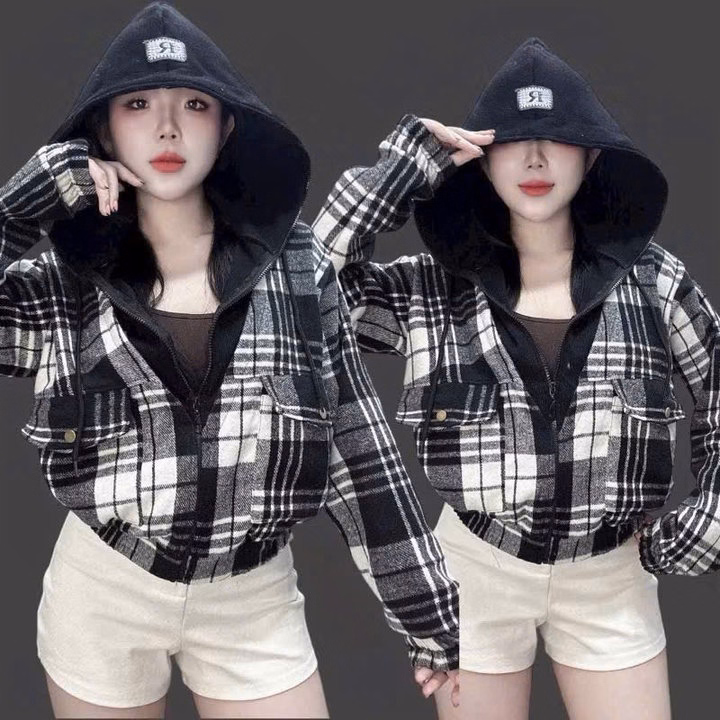 [T105] Áo Khoác Dáng Lửng Nữ Phối Sọc Caro Dáng Lửng , Thêu Chữ R Nón Rộng , Siêu To Chống Nắng Tốt