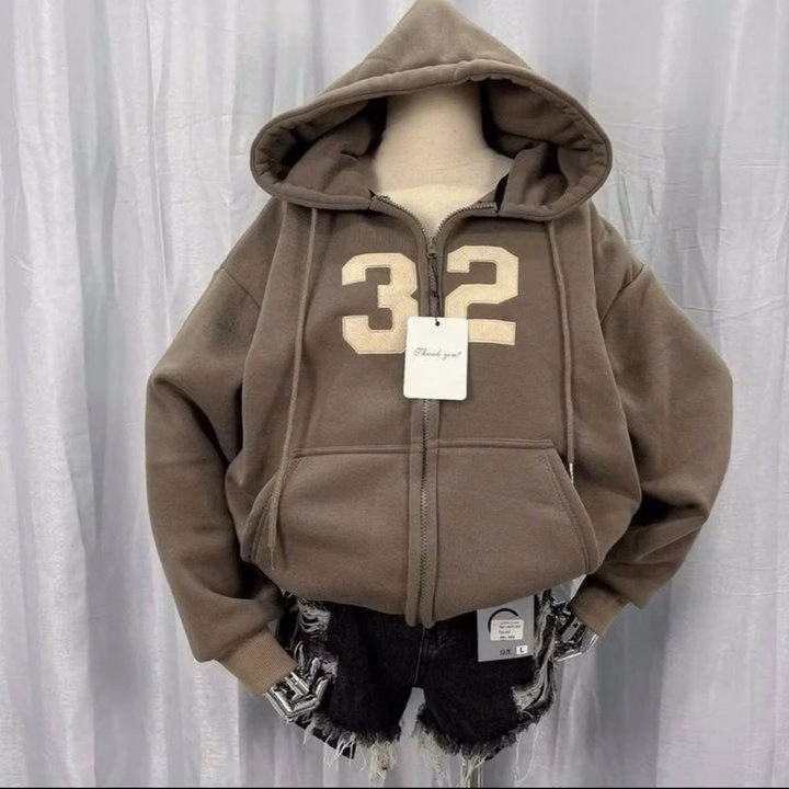 [T95] Áo Khoác Nỉ Dệt Nữ Thêu Số 32 Form Rộng , Dáng Boxy Lửng , Có Túi Trong Tay Xỏ Ngón Siêu Dày Dặn