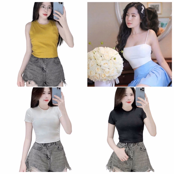 | Màu sắc | áo 2 dây bún đen, áo 2 dây bún trắng, áo ba lỗ đen, áo ba lỗ trắng, áo croptop trơn tăm đen, áo croptop trơn trắng |