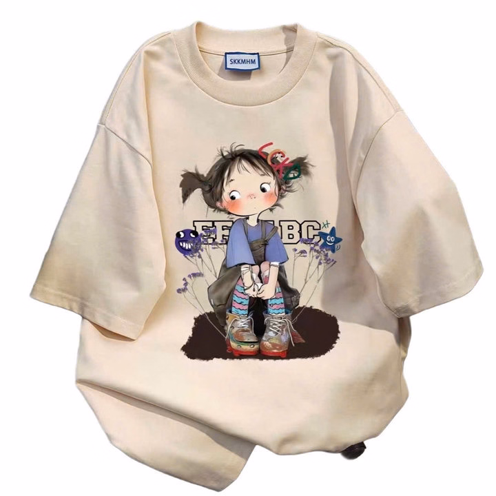 ( Lưu Ý Chất Su Mỏng Mát ) Áo Phông Form Rộng Tay Lỡ Chất Vải Cotton , Áo Cổ Tròn Nam Nữ Unisex – Hình Cô Gái Mặc Yếm