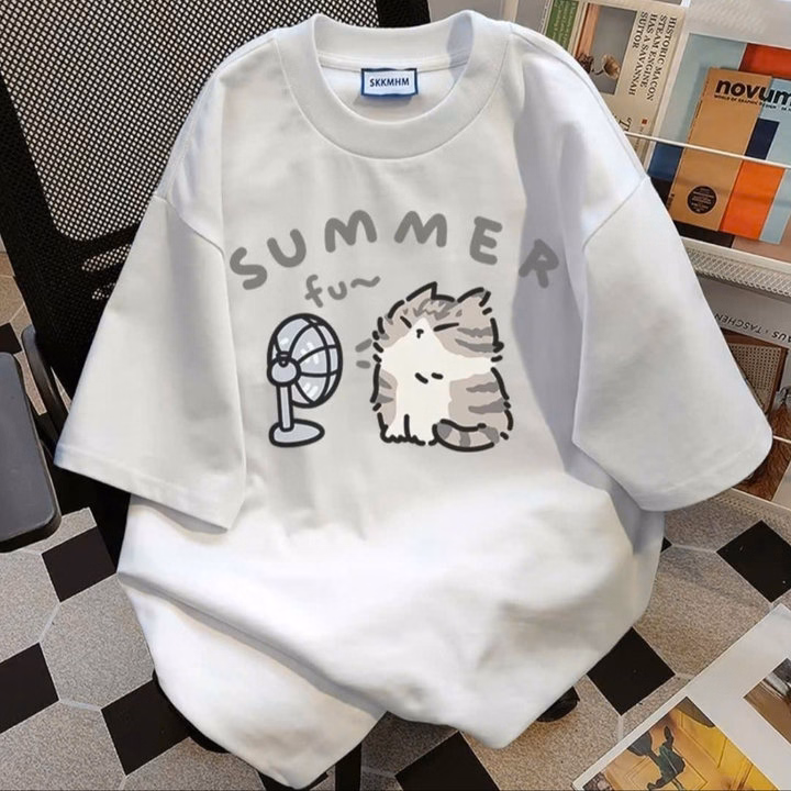 ( Lưu Ý Chất Su Mỏng Mát ) Áo Phông Form Rộng Tay Lỡ Chất Vải Cotton , Áo Cổ Tròn Nam Nữ Unisex – Hình 3 Con Mèo Trắng