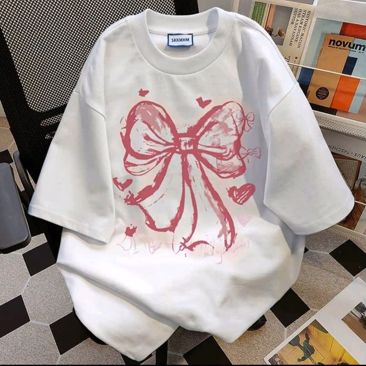 ( Lưu Ý Chất Su Mỏng Mát ) Áo Phông Form Rộng Tay Lỡ Chất Vải Cotton , Áo Cổ Tròn Nam Nữ Unisex – Nơ Loang Hồng