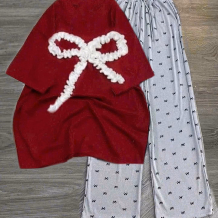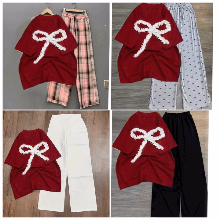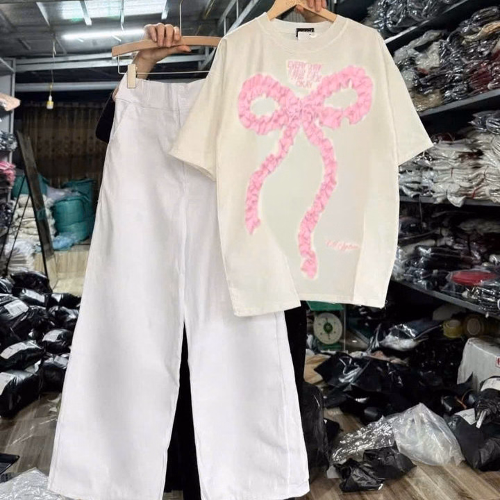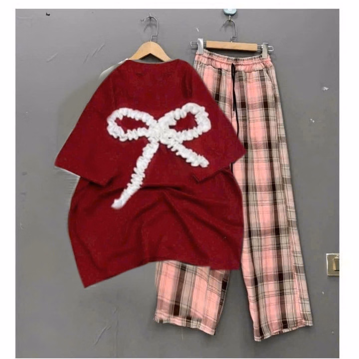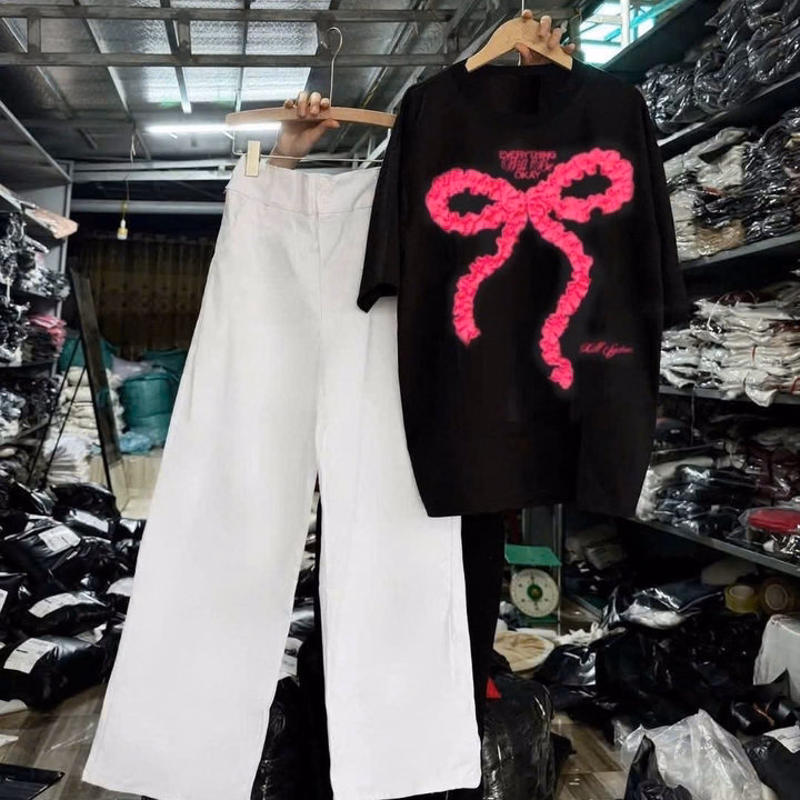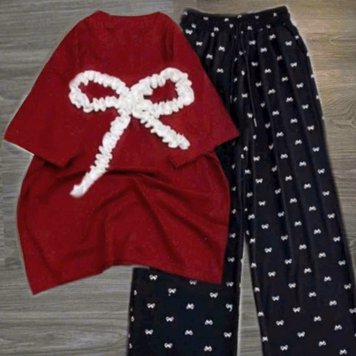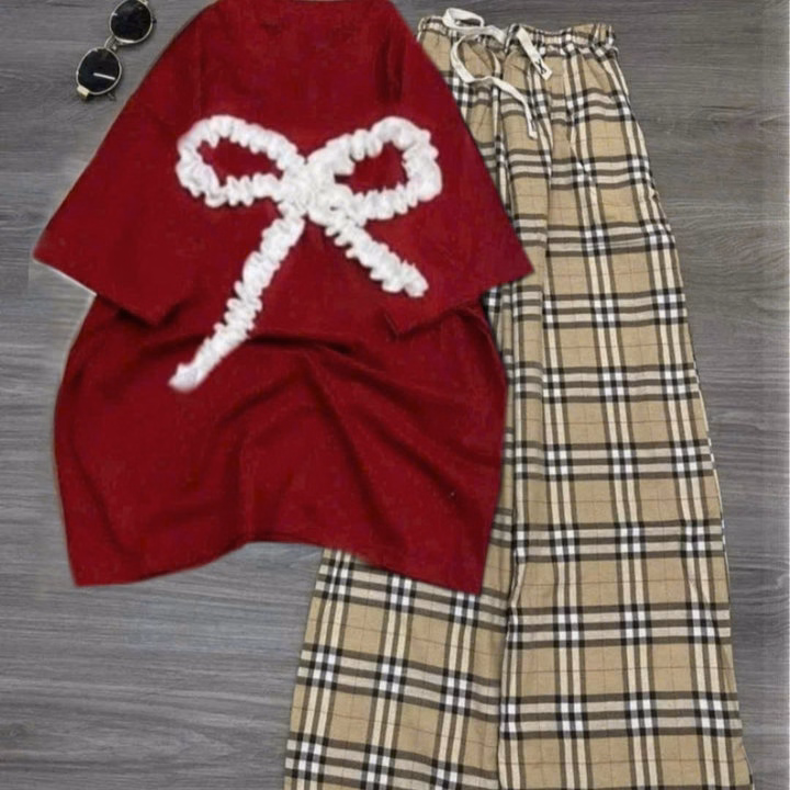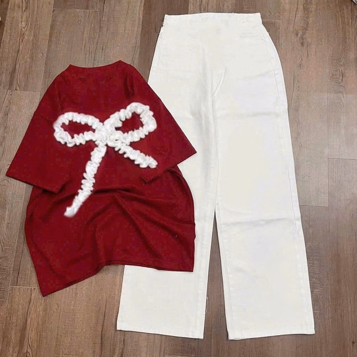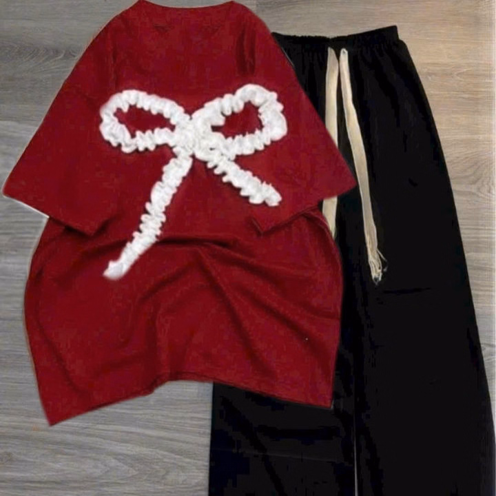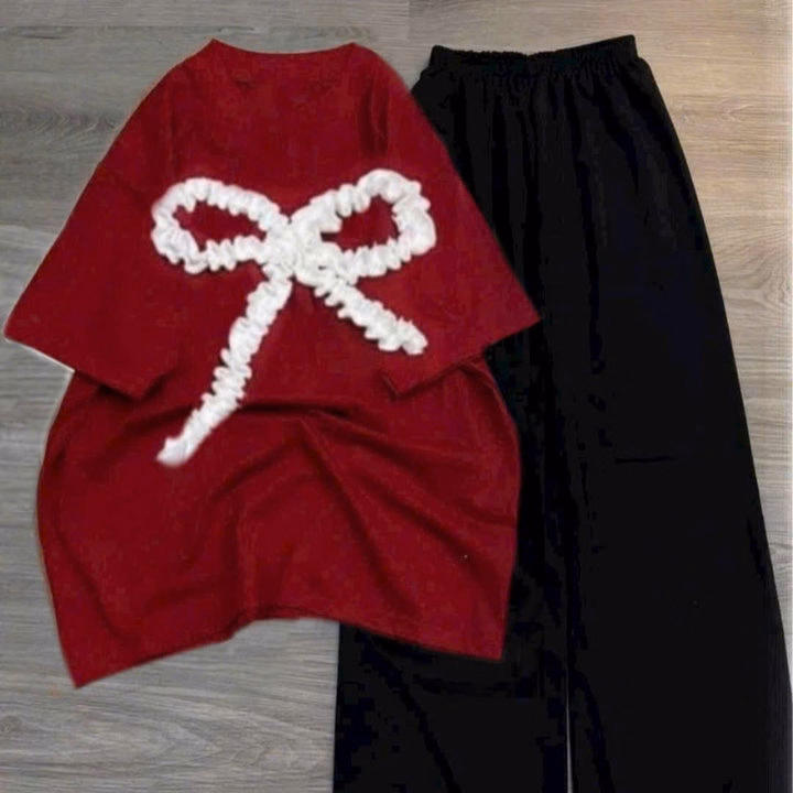 Tổng Hợp Các Mẫu Quần Ống Rộng + Mix Áo Phông Form Rộng Tay Lỡ- Hình Nơ Rúm Màu Đỏ