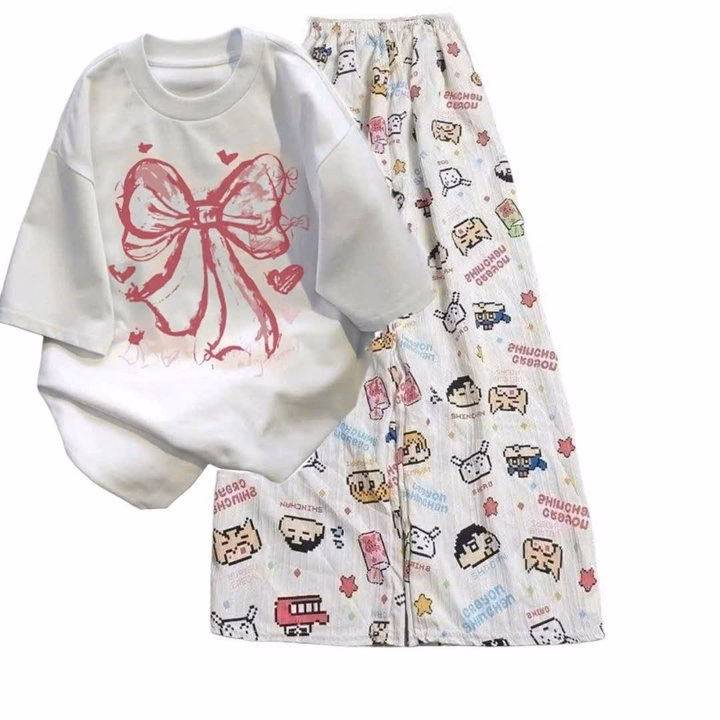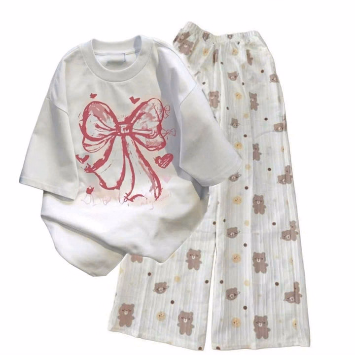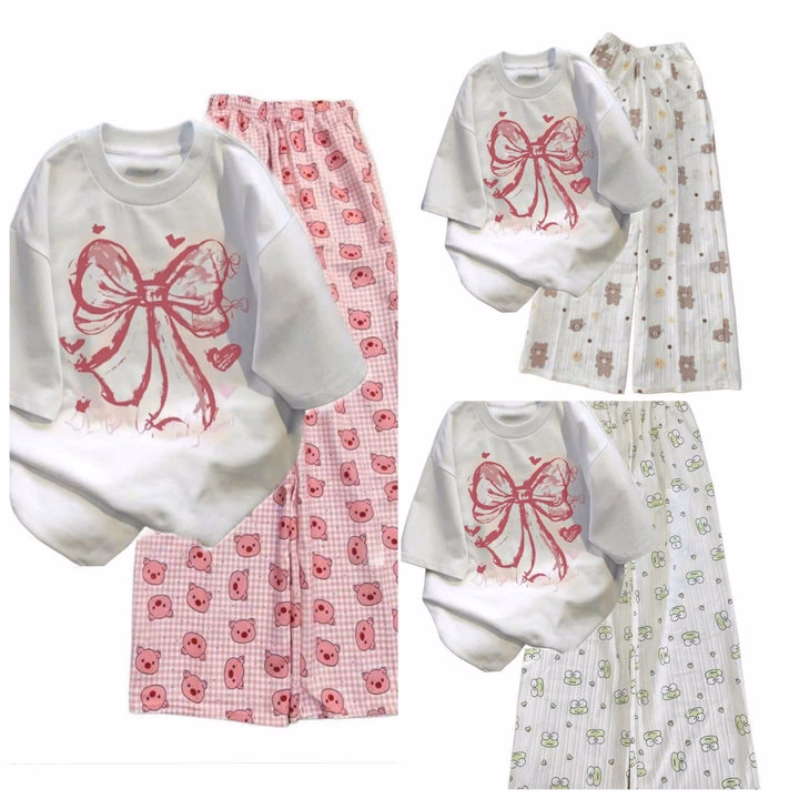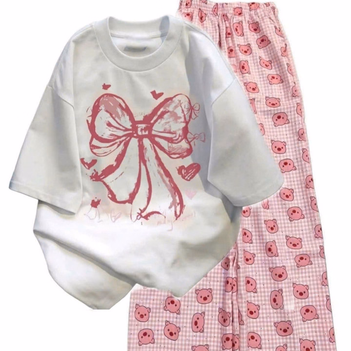 Tổng Hợp Các Sét Bộ Đồ Quần Hoạt Hình + Áo Phông In Nơ Hồng Loang Màu Trắng