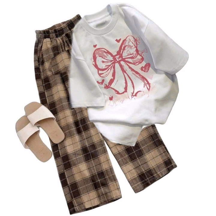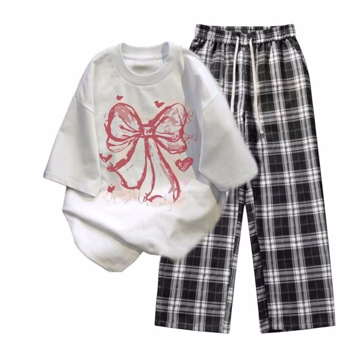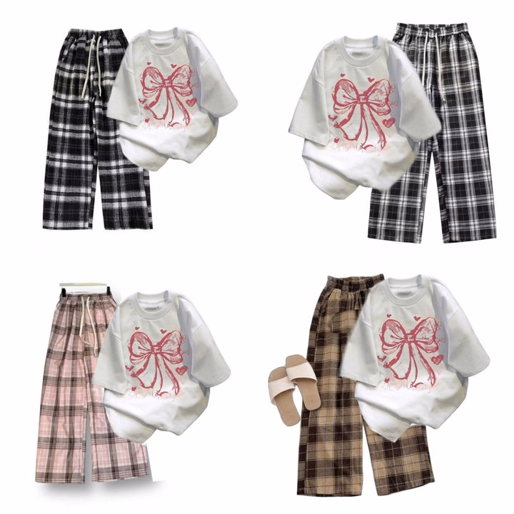 | Màu sắc | quần caro đen + áo phông in nơ hồng loang màu trắng, quần caro đen bản to + áo phông in nơ hồng loang màu trắng, quần caro đỏ + áo phông in nơ hồng loang màu trắng, quần caro hồng + áo phông in nơ hồng loang màu trắng, quần caro nâu + áo phông in nơ hồng loang màu trắng |