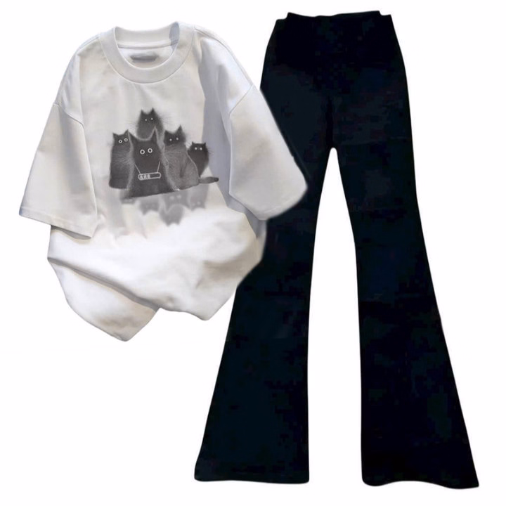 ( Lưu Ý Chất Su Mỏng Mát ) Áo Phông Form Rộng Tay Lỡ Chất Vải Cotton , Áo Cổ Tròn Nam Nữ Unisex – Hình 3 Con Mèo Trắng