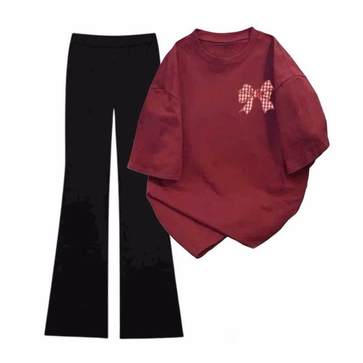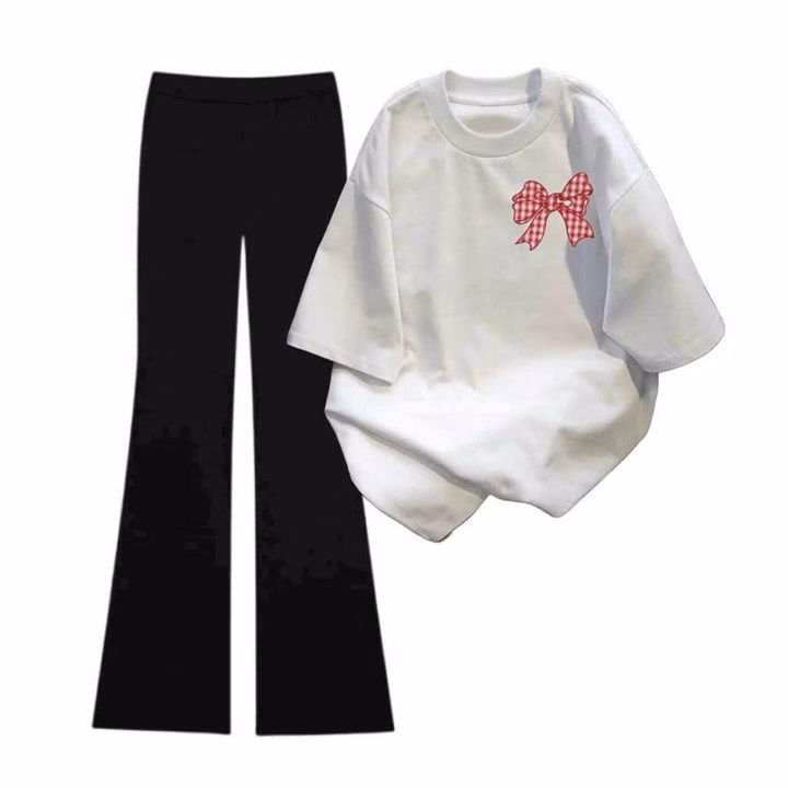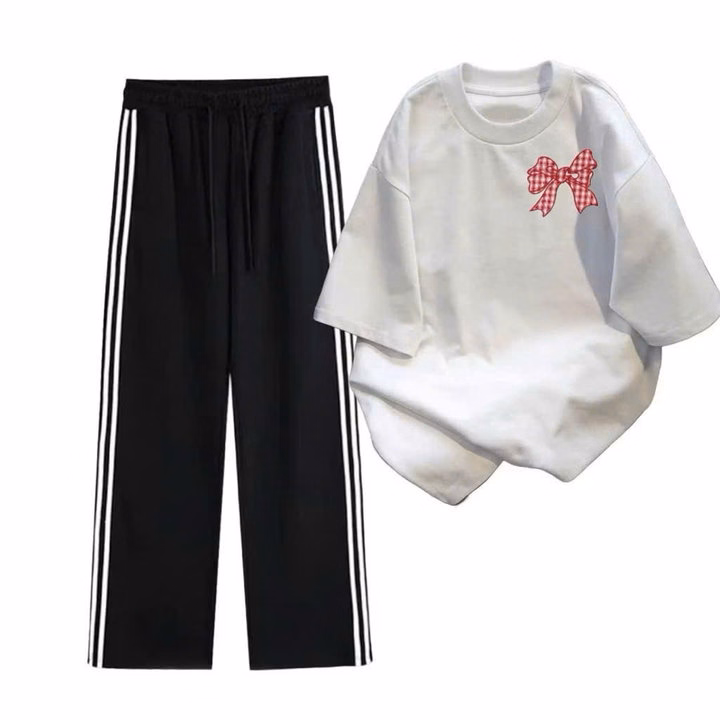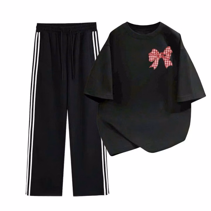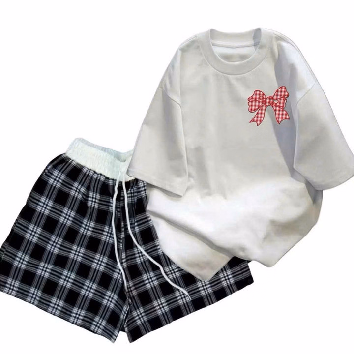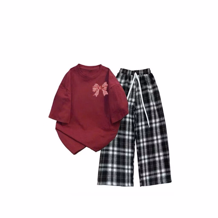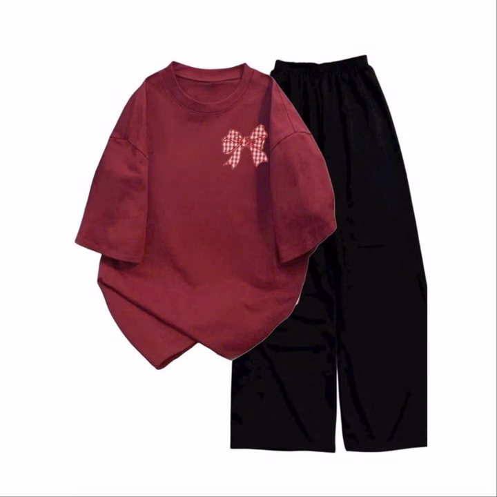 Tổng Hợp Các Sét Bộ Quần Ống Suông Dài+Mix Áo Phông Form Rộng -Hình Nơ Kẻ Caro Đỏ In Áo Ngực