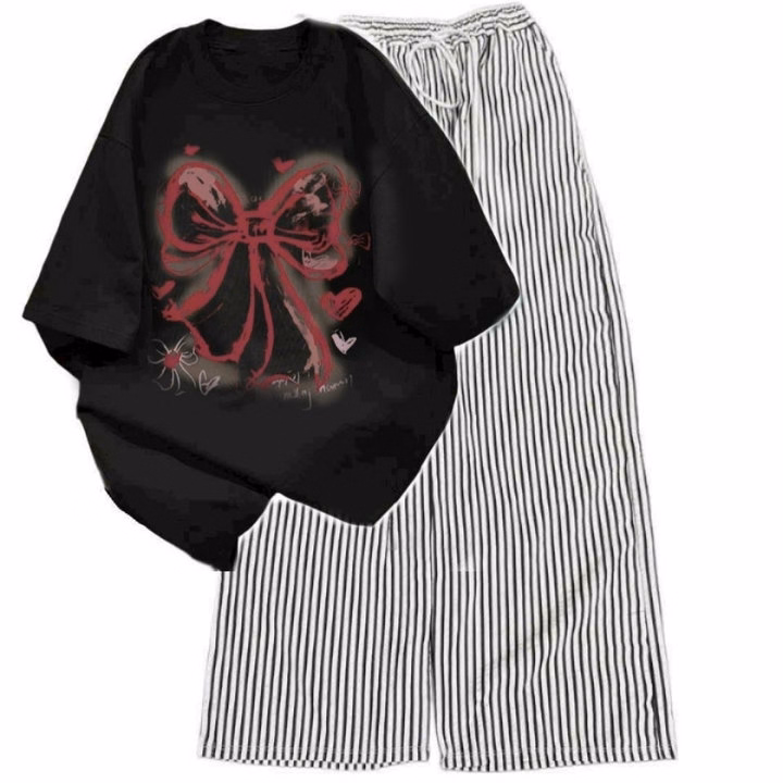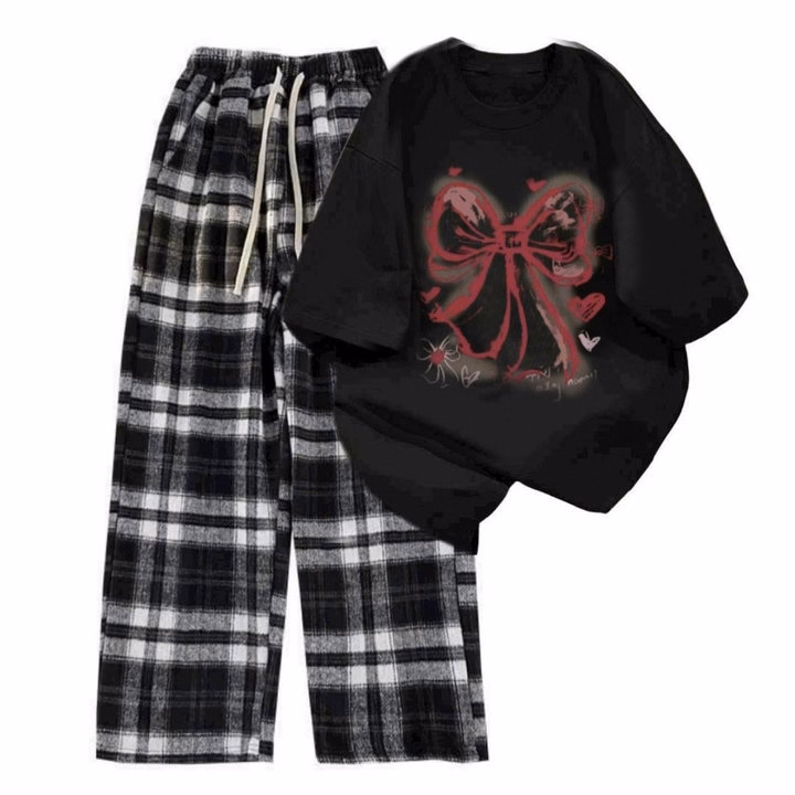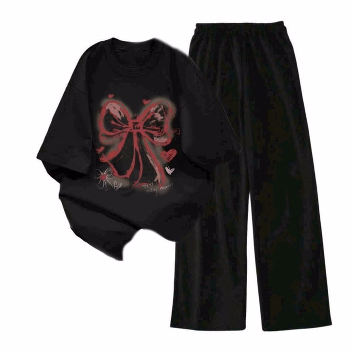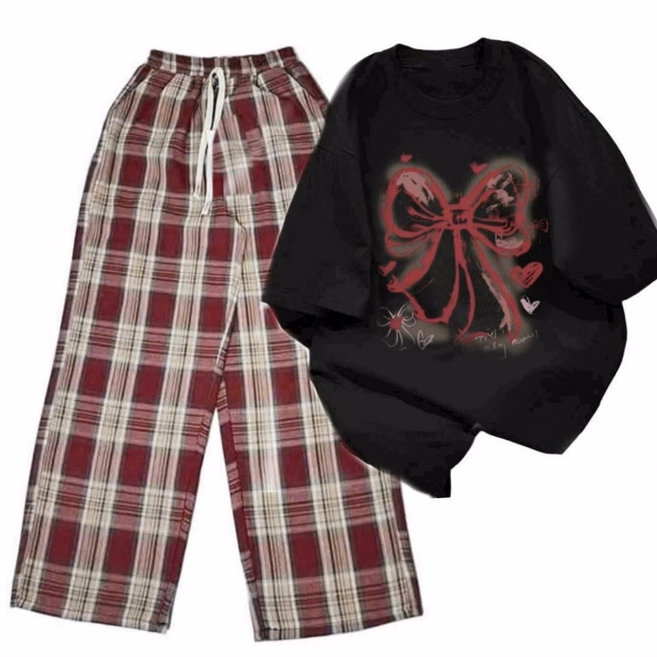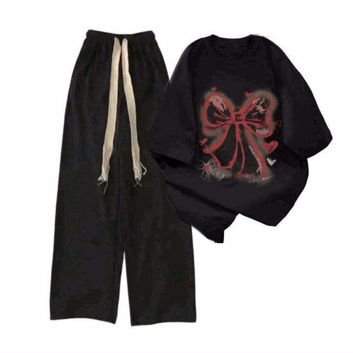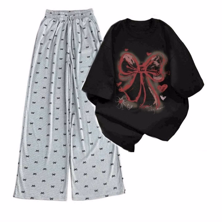 – Tên Sản phẩm: Tổng hợp quần ống rộng + mix áo phông nơ loang đen