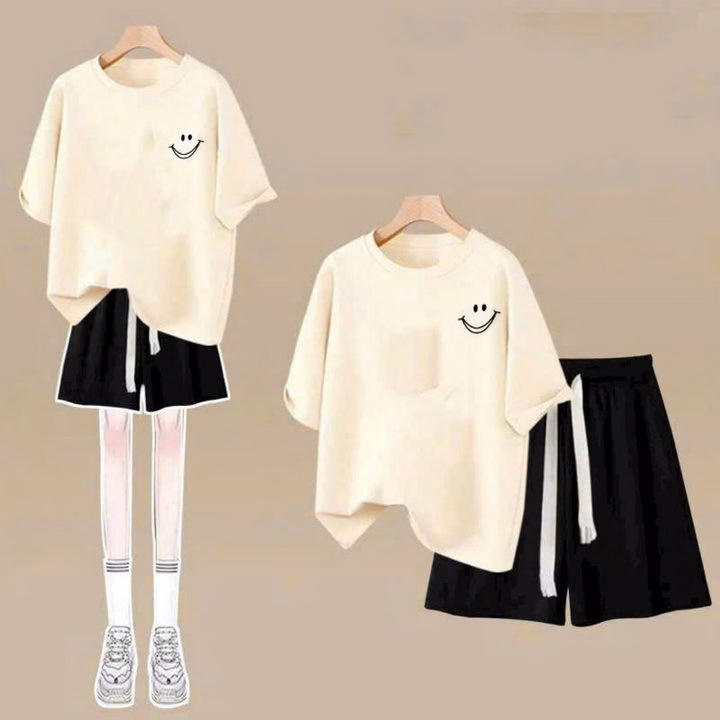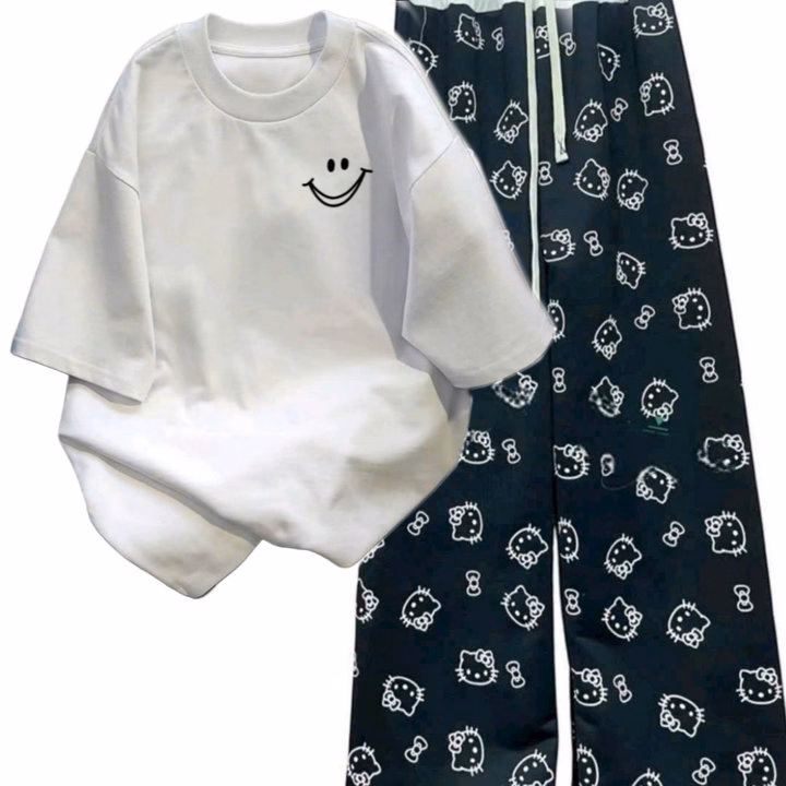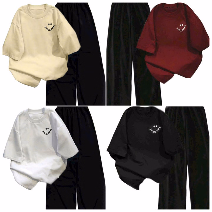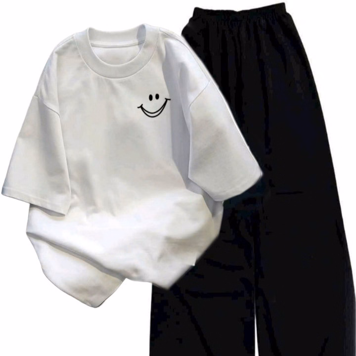 Tổng Hợp Sét Bộ Quần Cạp Chun+ Mix Áo Phông Form Rộng Tay Lỡ-In Hình Mặt Cười Ở Ngực