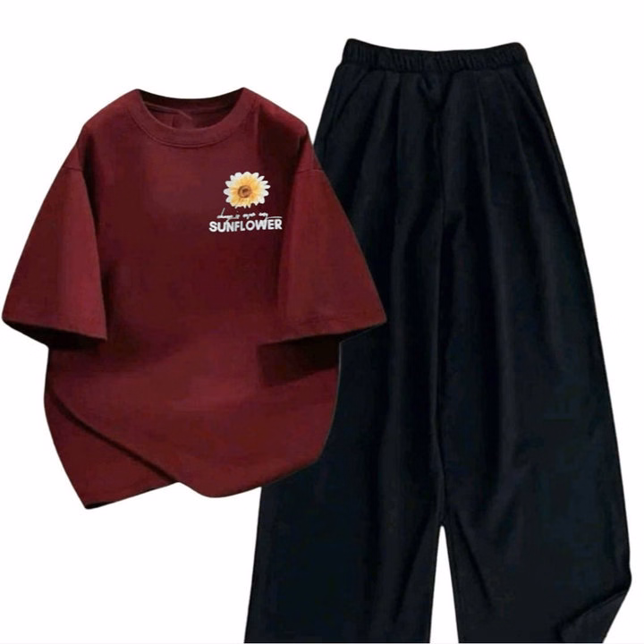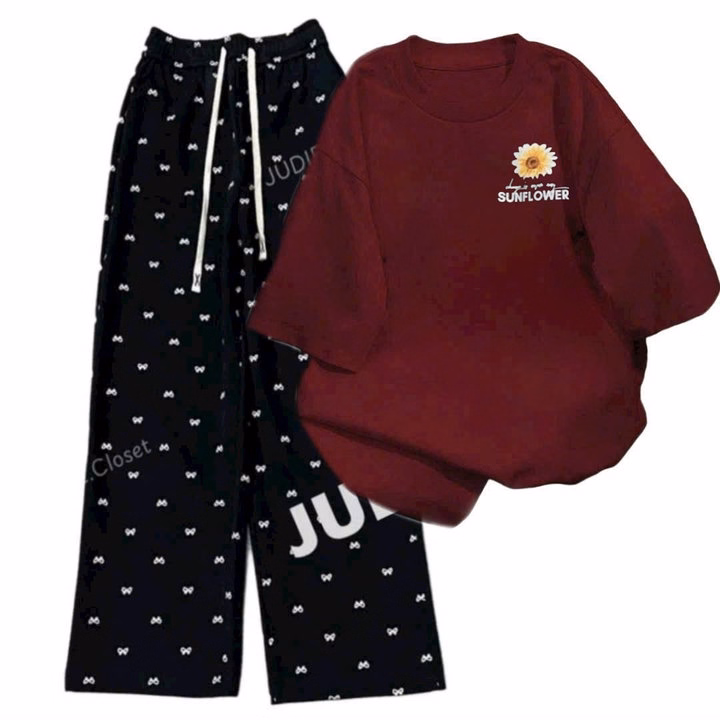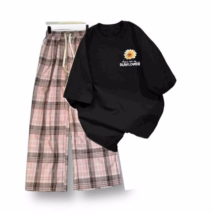 Tổng Hợp Set Bộ Quần Ống Suông Cạp Chun+Mix Áo Phông Chất Cotton_Hình Bông Hoa Cúc