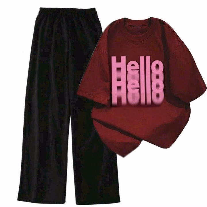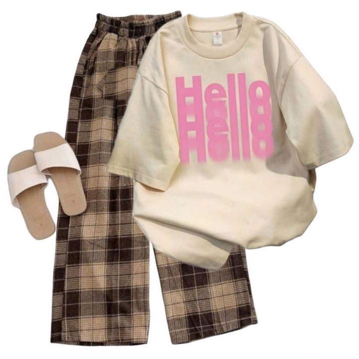 – Tên Sản phẩm: Tổng hợp set bộ quần ống suông cạp chun+mix áo phông mẫu mới- chữ He Lô