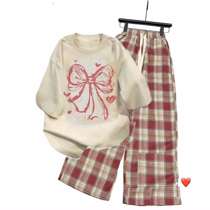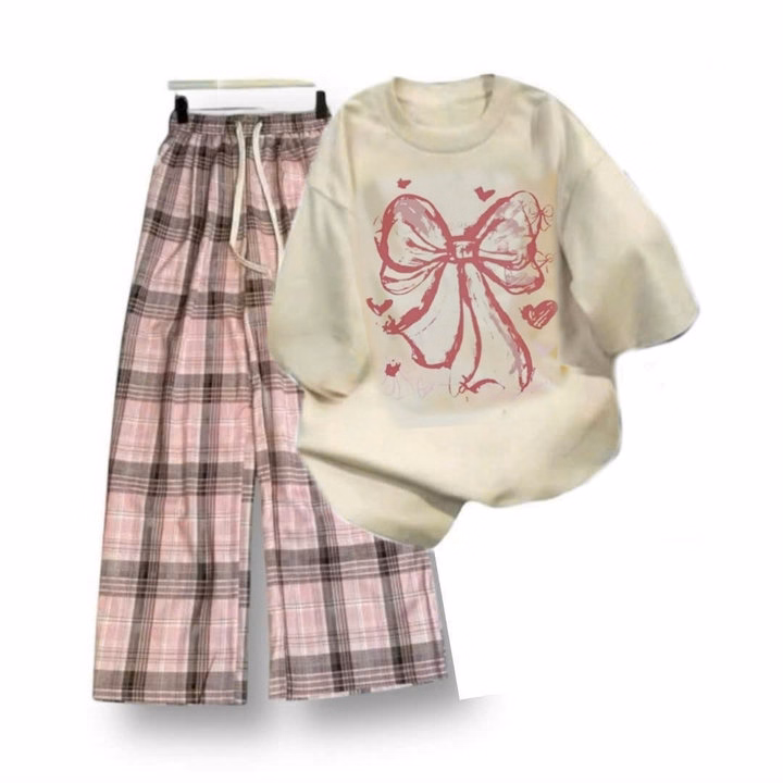 – Tên Sản phẩm: Tổng hợp set bộ quần ống xuông+mix áo phông mẫu mới-Nơ Hồng Loang