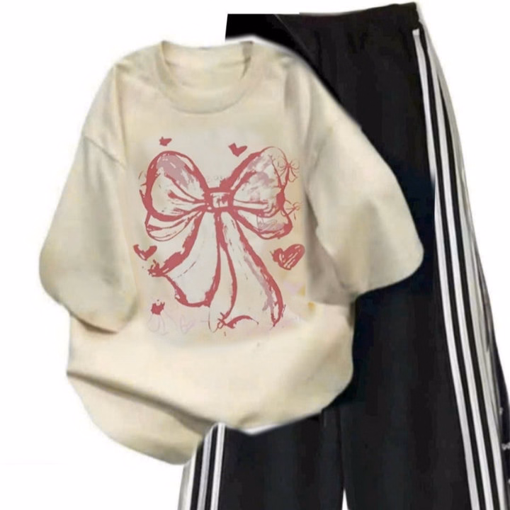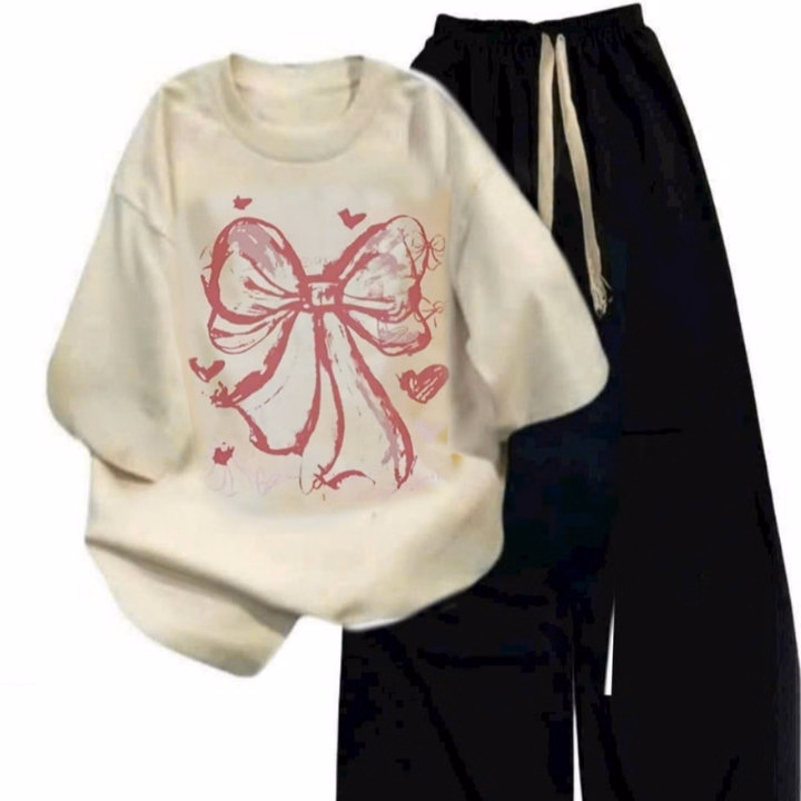 Tổng Hợp Set Bộ Quần Ống Xuông+Mix Áo Phông Mẫu Mới-Nơ Hồng Loang Màu Be